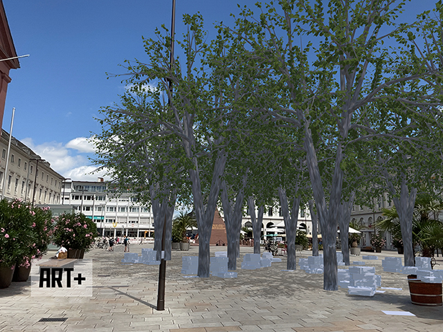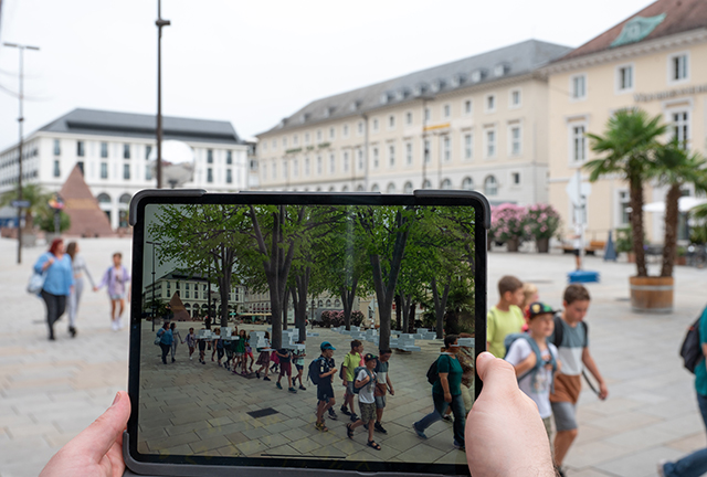 paper trees; Augmented Reality App, showing AR Trees in relation to paper consumption; Marketplace Karlsruhe, UNESCO Media City Festival, 2023, Photo: City of Karlsruhe, ongoing project, paper trees; Augmented Reality App, showing AR Trees in relation to paper consumption; Marketplace Karlsruhe, UNESCO Media City Festival, 2023, Photo: City of Karlsruhe, Unikat